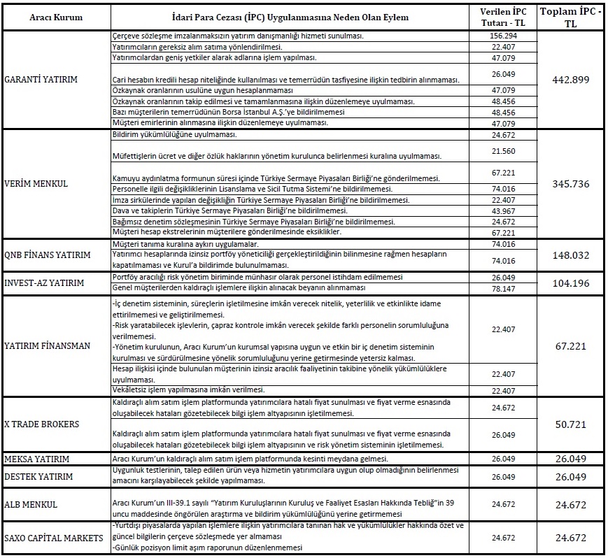 Aşağıdaki tabloda Sermaye Piyasası Kurulu tarafından Aracı Kurumlara uygulanan İdari Para Cezaları toplulaştırılarak gösterilmiştir. Tablodan da görüleceği üzere SPK tarafından en çok ceza verilen kurum 442.899 TL ile Garanti Yatırım olmuştur. Toplam 10 adet şirkete verilen cezalar 3-4 şirket dışında çok sınırlı kalmıştır.