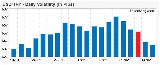 Peki piyasa verileri yapılan bu açıklamayı doğruluyor mu? Aşağıdaki grafik USD/TRY paritesindeki volatiliteyi gün bazında gösteriyor. Kırmızı sütun bu haftanın ilk günü yani ayın 13’ündeki volatiliteyi gösteriyor. Son 3 günlük verilere bakıldığında Sayın Bakan’ın açıklamalarını verilerin doğruladığı görülüyor.